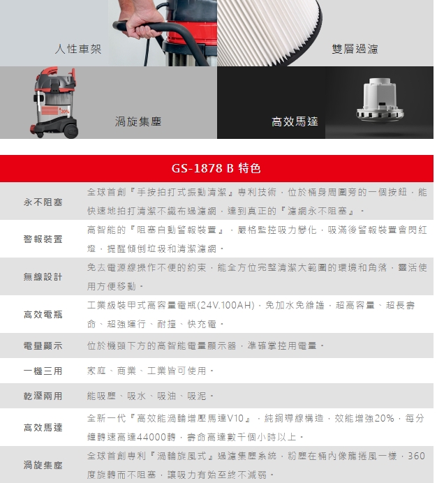 專案限量GS-1878 B *無線型 電瓶式 三顆馬達 *渦輪旋風式馬達規格: 80公升