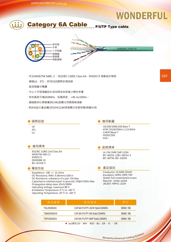 10G BASE-T等網路傳輸標準。適用於資料、影像、聲音等傳輸,傳輸頻寬可600MHz以上,更能 運行10Gigabit Ethernet(可跑10G網路卡/集線器),銅導體外具有 HDPE材質被覆,可有效隔離電磁波及靜電之干擾,適用於易被干 擾之惡劣環境,另有單跟金屬接地線提供遮蔽系統完整接地。