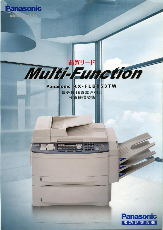 KX-FLB853 A4,ADF50張,33.6K,10MB,Caller ID,定時/記憶/多站傳送,USB2.0具傳真/平台式影印/印表/彩色掃瞄/PC-FAX ,三段出紙口設計