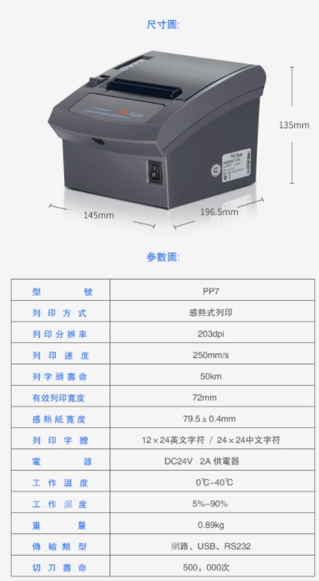 PP7X 熱感式,感熱式,79mm,傳輸介面:RS 232C / parallel / USB主要規格: