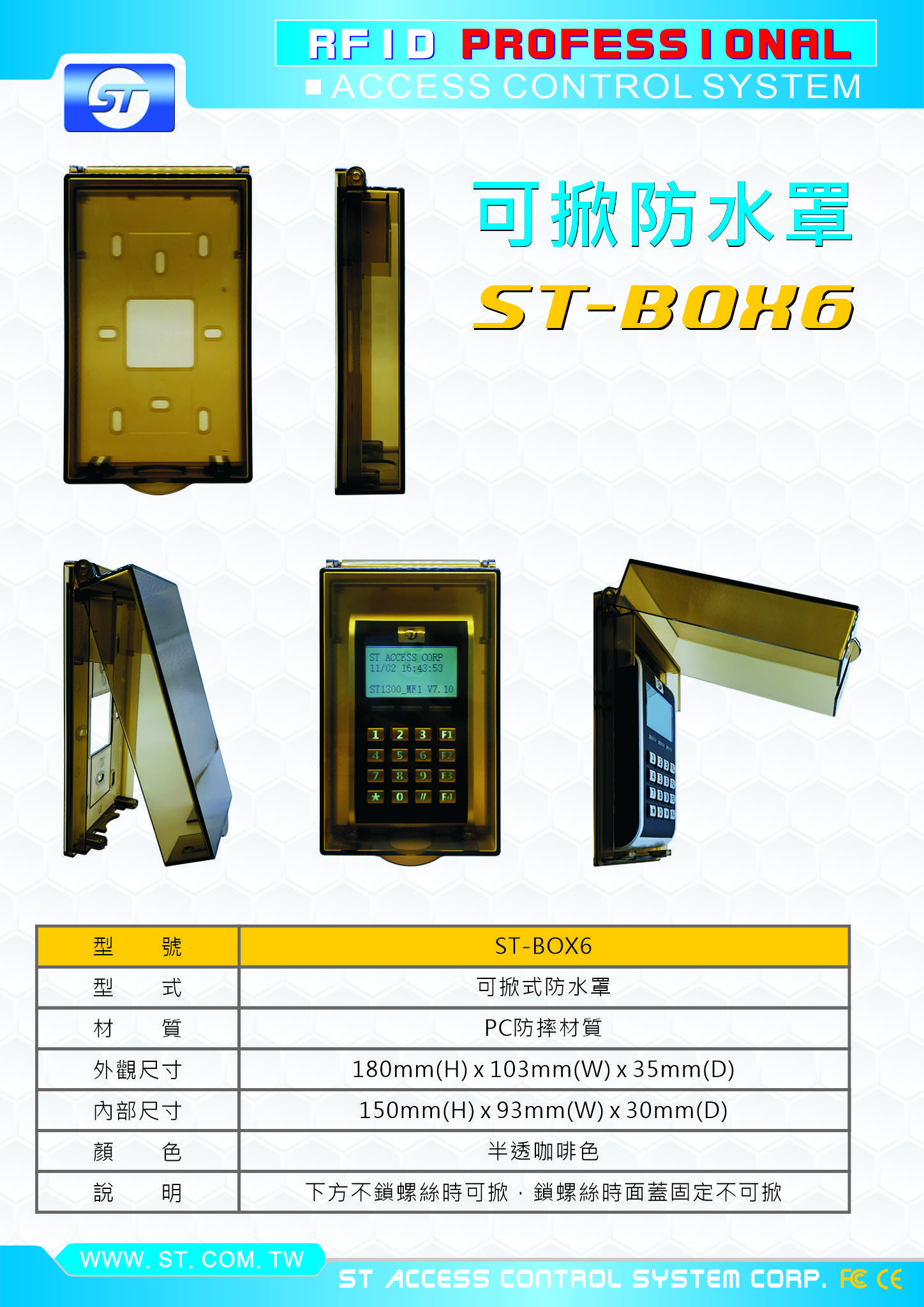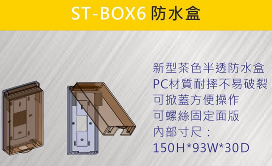 飛強系列-->ST-BOX6 可掀式PC防水罩(通用型) 下方可鎖螺絲固定掀蓋 內部尺寸: 15H x 9.3W x 3D cm)商品查詢代碼:QK79813