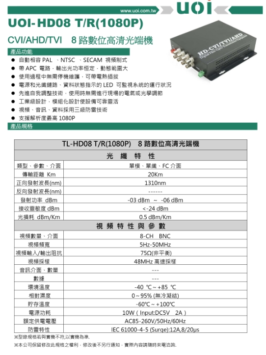 «¬¸¹:UOI-HD08 T/R(1080P) CVI/AHD/TVI 8¸ô¼Æ¦ì°ª²M¥úºÝ¾÷