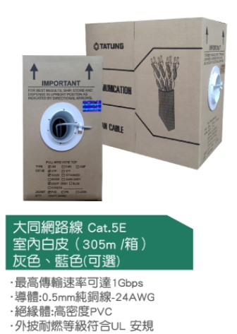 大同網路線 Cat.5E 室內白皮 灰色、藍色(可選)(305m /箱) |