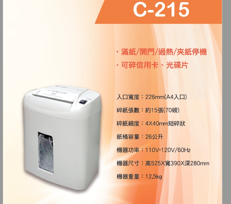 型號:Resun C-215 超靜音雙入口A4碎紙機 《可碎光碟》碎紙尺寸4*40 ~