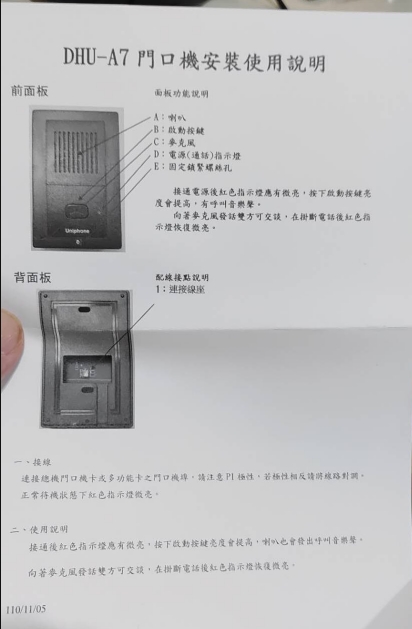 @@@需搭配聯盟門口機卡 ISD-DHVR 門口機通話開門卡 @@@聯盟標準型門口機DHU-A7 (單機型緊急對講機). ◇二芯有極性配線。 ◇單鍵按鈕呼叫。 ◇內含喇叭及麥克風。 ◇可接單機埠。 專業研發.技術領先
