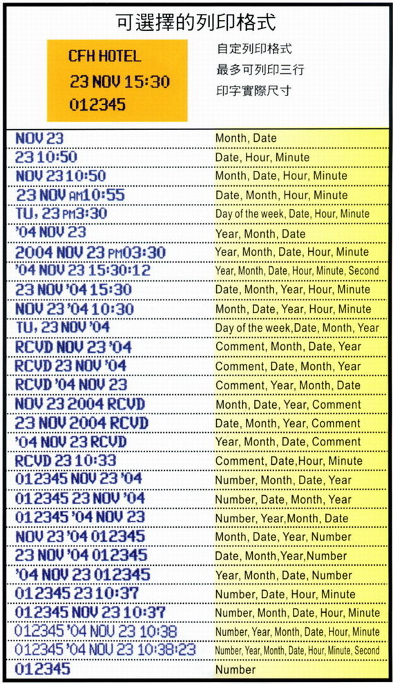 有29種的列印格式可供選擇,例如:"04 NOV 23 15:30:12"