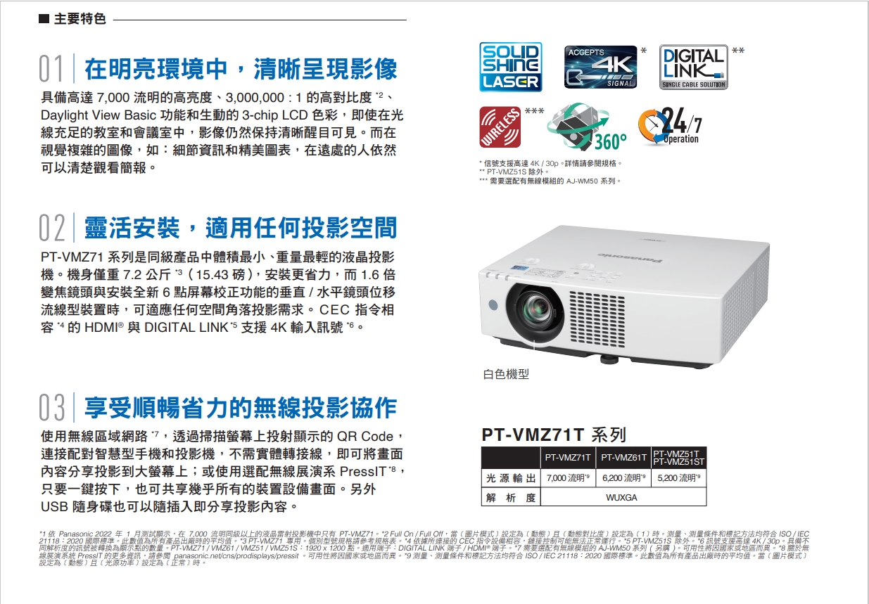 型號:【最新機種】Panasonic 國際牌 PT-VMZ51T雷射投影機 [WUXGA,5000ANSI]