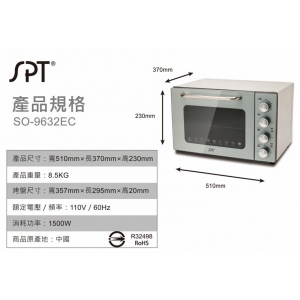 品 名 32L雙層鏡面旋風氣炸烤箱 型 號 SO-9632EC 消耗功率 1500W