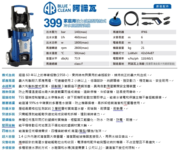 專案限量阿諾瓦AR399 140Bar 家用輕巧型冷水高壓清洗機