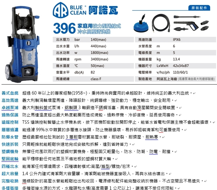 專案限量阿諾瓦AR396 140Bar 家用輕巧型冷水高壓清洗機