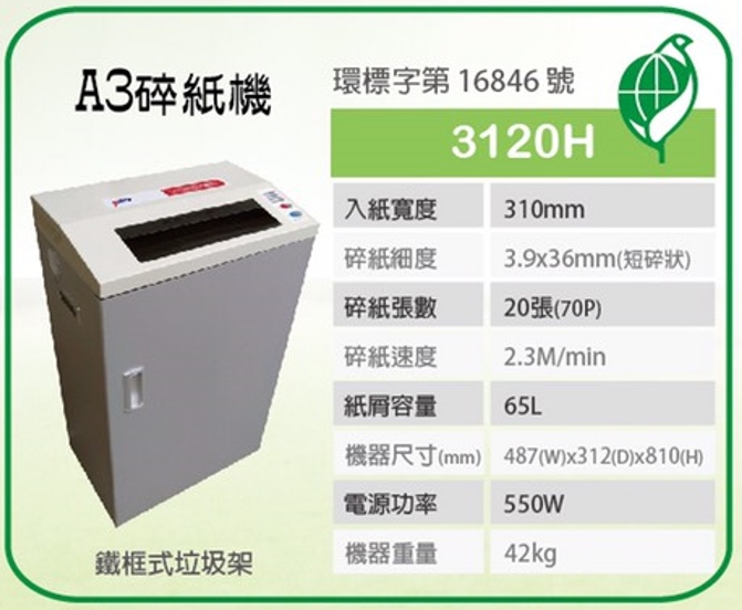 型號:西德風 SYSFORM 3120H 台灣環保標章短碎狀碎紙機