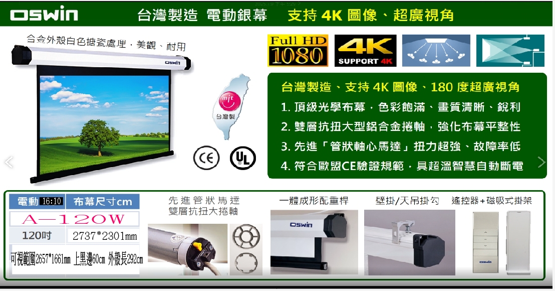 專案限量OSWIN 120吋16:10 A-120W 電動銀幕 布幕尺寸2737*2301mm 可視範圍2657*1661mm 上黑邊60cm 外殼長292cm