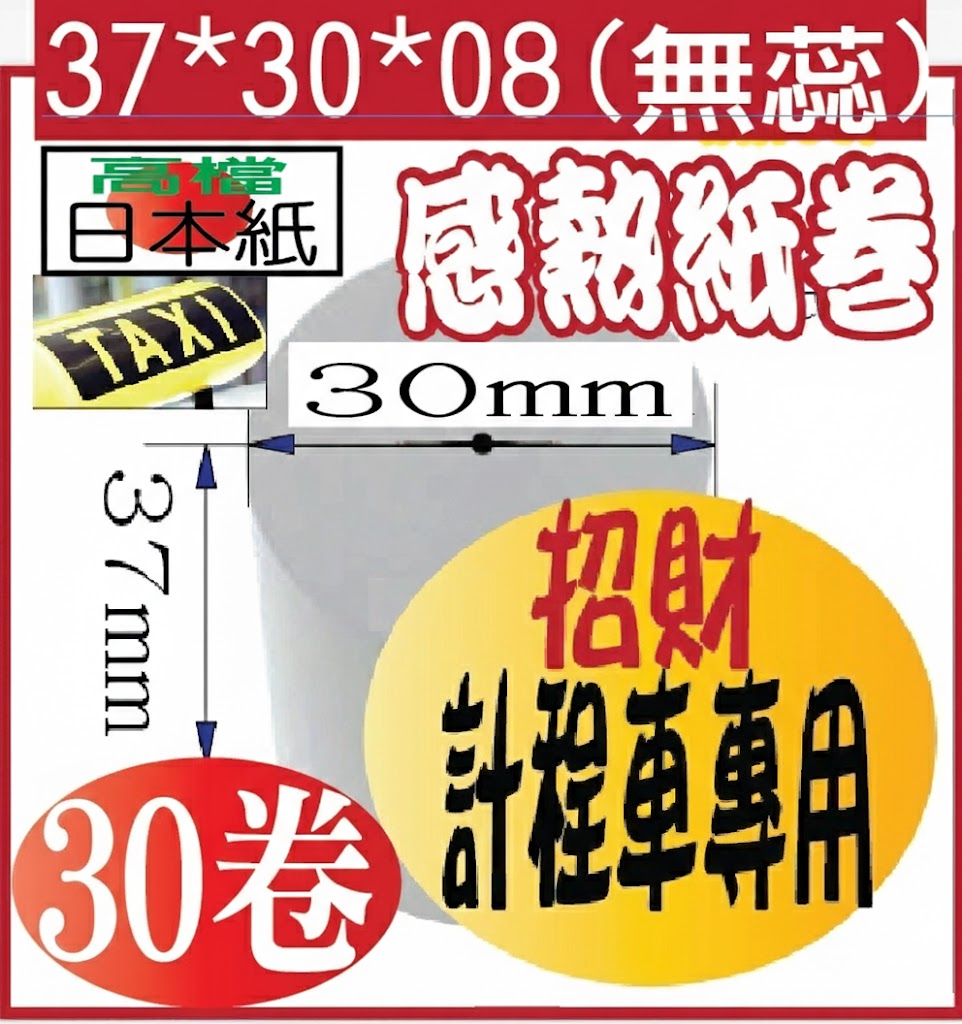 POS熱感應紙捲-->招財計程車新表專用熱感應紙捲37*31.5*08(無蕊)*外感拾件超值組合 好朋友分享匯款價三件超值組合商品查詢代碼:QK86861